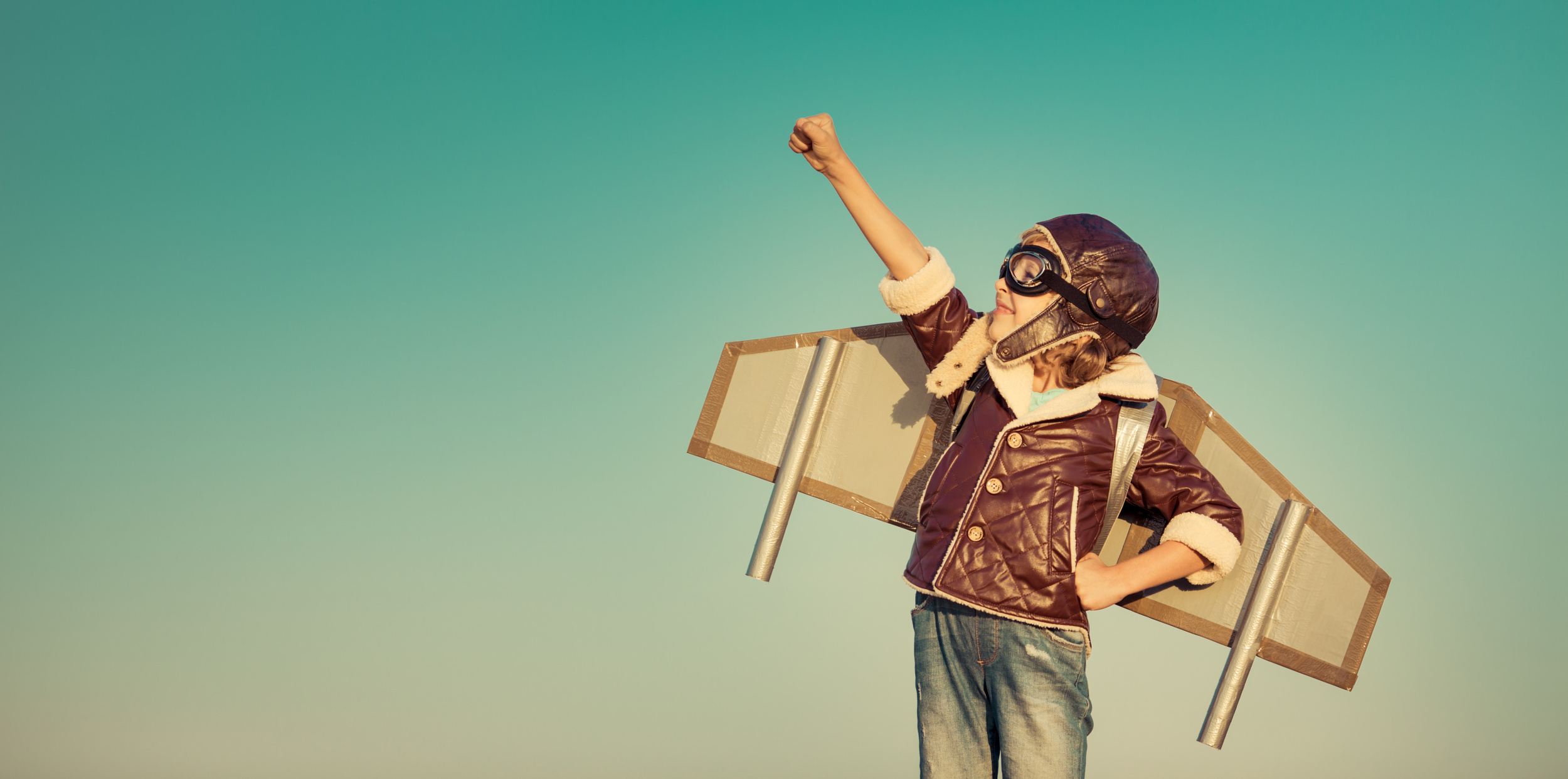 Boy With Plane Wings Cropped Kid pilot with toy jet pack against autumn sky background. Happy child playing outdoors