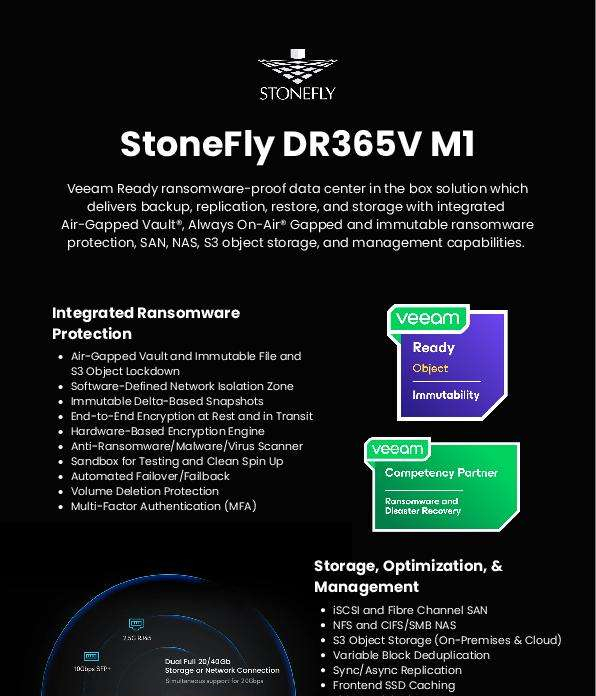 Protecting business data requires speed, security, and resilience—the DR365V M1 delivers on all three. With Veeam-ready integration, NVMe storage, multi-layered ransomware protection, and high-speed networking, this solution provides seamless backup, replication, and restore operations. Whether you’re managing an SMB or a large enterprise, the DR365V M1 ensures data integrity, fast recovery times, and scalable storage expansion to keep your operations running smoothly. DM Beta Corp for more information. @StoneFly, Inc.